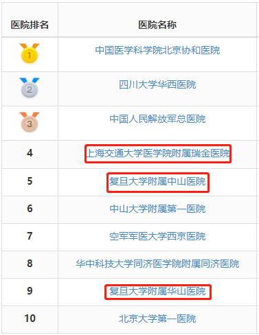 包括张文宏所在的复旦大学附属华山医院、上海交通大学医学院附属瑞金医院、复旦大学附属中山医院,这3家全国TOP 10医院,也是上海最好的医院。