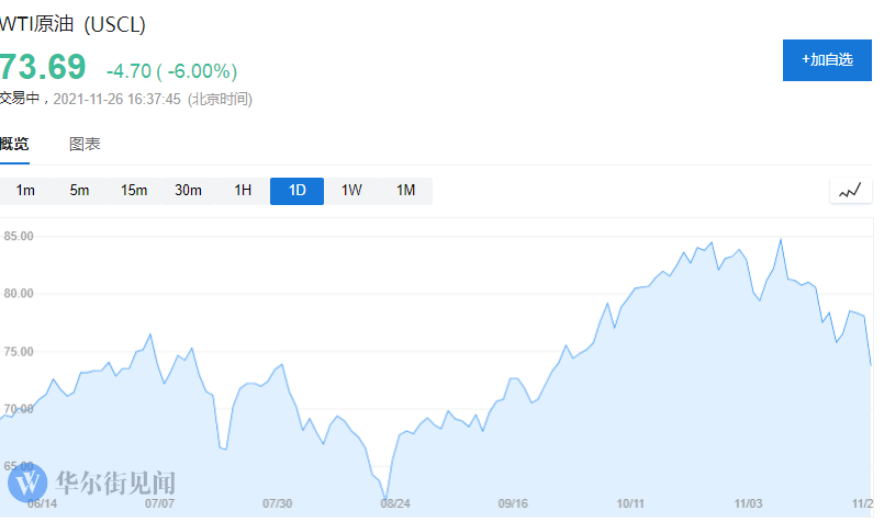 国际油价也快速下挫,WTI原油期货跌幅扩大至6%,报73.69美元/桶。