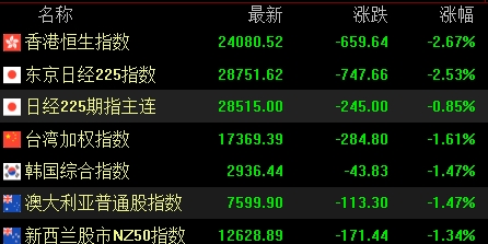 港股低开低走,跌幅持续扩大。恒指收跌2.67%,创逾一个半月低位。日经225指数跌2.53%,富时新加坡海峡指数跌近2%,韩国综合指数收跌1.47%,印度下跌2%。
