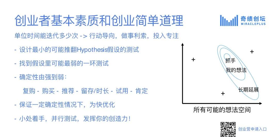 所以我们在这种动态的状态下,在时间和能源都有限的情况下,我们要保证一定的确定性,为快优化。我们今天的很多创业者,尤其是做工程技术的,他们是为产品的质量去做优化的,但对创业阶段的人来说,这不是一个特别好的路径。因为我们创业最终是要验证PMF的,所以他还是要为快去做优化。我们必须要从小处去着手,尽量去做并行测试,甚至在某些情况下需要不断的发挥你的创造力。