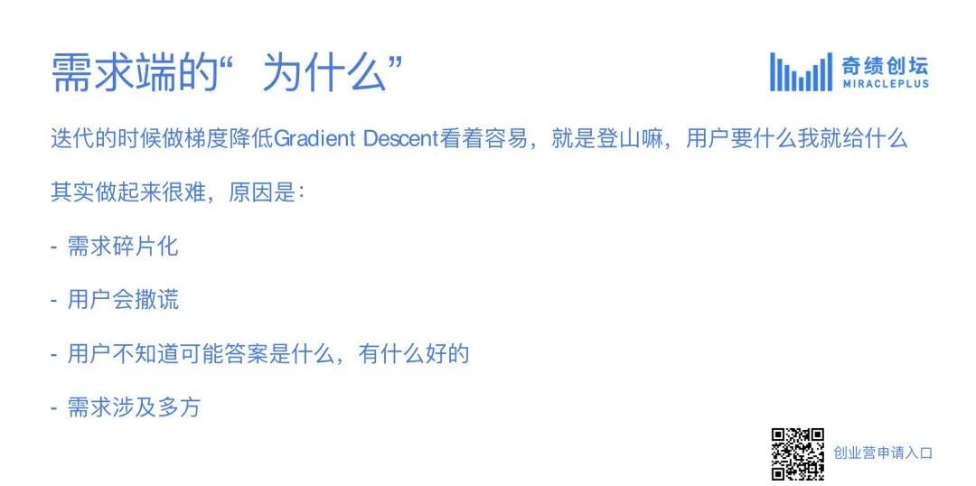 我们刚刚在说迭代的时候,说到要做梯度降低。梯度降低看起来容易,但做起来很难。以我目前观察到的情况,我归纳了几个原因。一是需求碎片化,二是用户在某种意义上不诚实,三是用户可能不知道解决方案是什么,四是需求涉及多方。