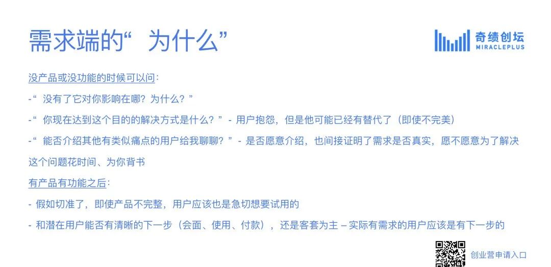 在还没有产品或者功能的时候,你可以问,比如说没有这样的一个功能,它对你的影响到底在哪?你今天是不是已经有可替代的解决方案了?你现在为了达成这个目的的解决路径是什么?有可能是我多招一个人,或者有的时候我干脆就不去管了。虽然用户嘴上抱怨这是一个很大的问题,但他可能已经有替代了,即使不完美它还是照样活下去了。然后我还可以问,你能不能介绍一些你觉得有碰到类似痛点的用户和我聊聊。这是一个非常关键的问题。为什么?首先他愿不愿意介绍就代表了他愿不愿意跟你花时间。如果你是一个很差的创业者,或者这是一个很差的项目,那这可能就把他的牌子也砸了。所以他们在愿意为你做背书、做介绍的时候,也是证明了有一定的需求。