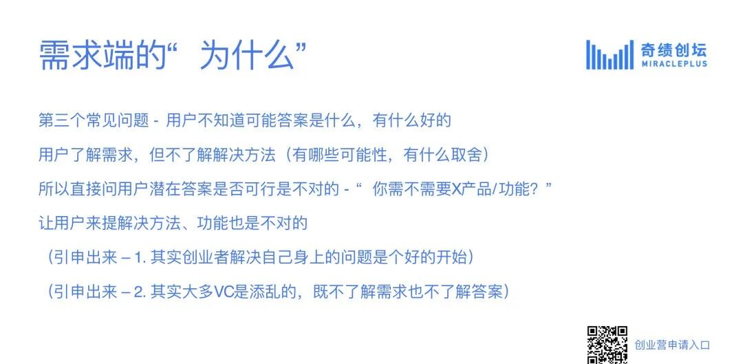 第三个问题,用户可能不知道答案是什么。用户了解需求,但他们并不了解解决方法。解决方法也分为很多种,一种是解决方法的可能性。因为用户通常和你不是同行,他也不知道有哪些可能的解决方法,然后他也不知道这些方法之间有什么取舍。就像很多人本身不是做技术的,他也不知道产品怎么做,也不知道技术该怎么做。所以我们很多创始人甚至我自己当时也多次犯了这样的错误,我们直接去问潜在用户,我做的这个东西你要不要?听上去像是一个很正常的问题对吧?有的时候,我们强迫创始人去跟用户聊天,然后他们问着问着就说“我今天在做这个产品,你要不要?”他们想通过这个简单粗暴的问题得到一个回应。但我跟大家说,这是不可能的。让用户自己来提解决方法,提功能是不对的,因为他们自己其实不知道有什么样的取舍,有什么样的功能。