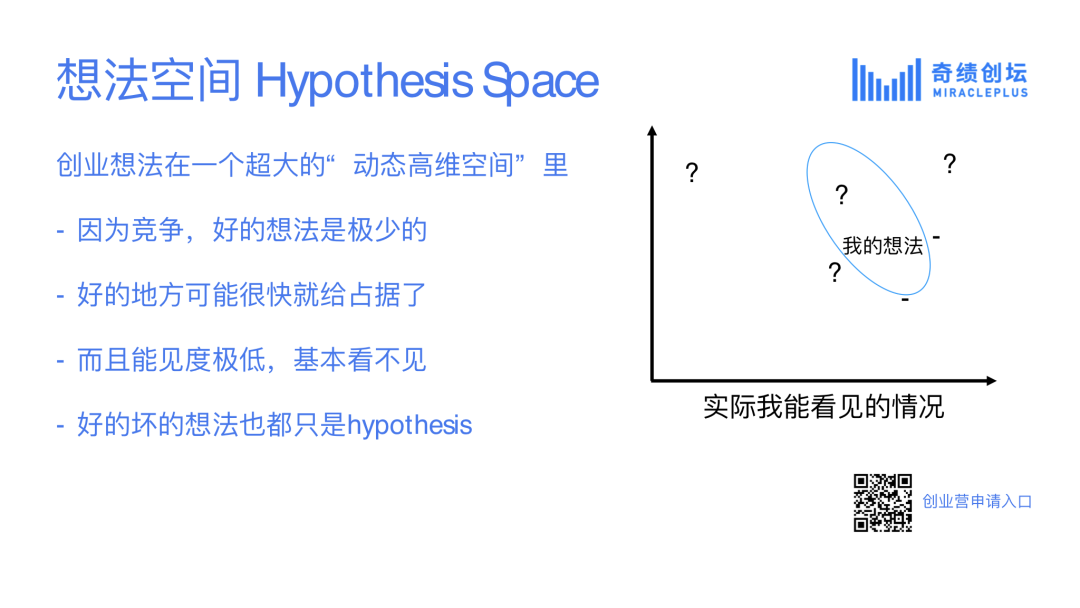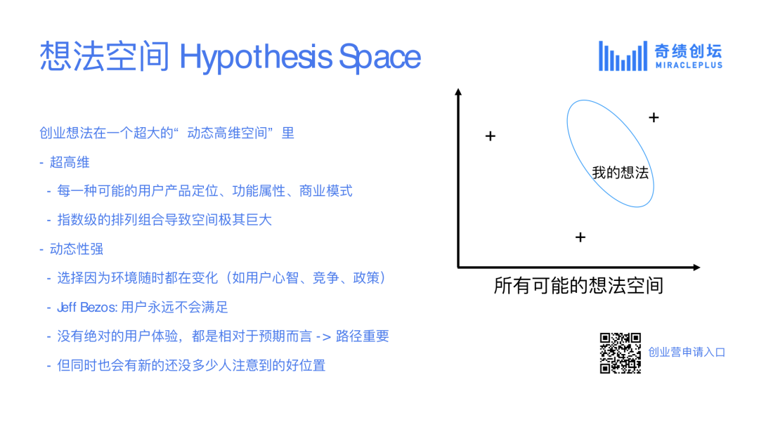 在我们创业的过程中,我们会产生非常多的想法,我把它定义为一个“想法空间”,然后用椭圆形来表示它。但并不是所有的想法都是好想法,所以我在我认为是好想法的地方都标上了一个加号。这些想法处在一个超高维的动态空间里,为什么这么说?因为可供做产品的空间实在是太大了。比如说,你的产品定位是什么?你的商业模式是什么样的?你的功能属性是什么样的?每个问题都能有无数种可能,而这些性质之间可以有无数种排列组合方式,所以说整个“想法空间”是特别广阔的。