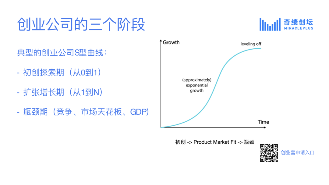 进入我们的主题,首先我想从创业的核心讲起。创业的核心是什么?简单给大家描述一下每个创业公司必经的三个阶段,也就是经典的创业公司S曲线。今天我们遇到的大多数公司都处在S曲线的底部的位置,这个阶段叫初创探索期,也就是我们常说的0-1的阶段。然后曲线当中呈指数增长的这一段,我们叫扩张增长期,也就是1-N阶段。最后项目会遇到一个瓶颈期,可能是因为市场天花板不高、市场不大、存在其他竞争者;也可能因为市场比较分裂、壁垒不高,或者说项目的盘子已经铺的很大了等等。这时候企业就需要去找第二甚至第三发展曲线。巴菲特说过一句话:一个公司最终的增长速度会慢慢趋于所在国家的GDP的增长速度。大家可以思考一下,确实是这个道理。当公司到一定规模之后,在某种意义上它的增长跟国家GDP的增长必定是挂钩的。