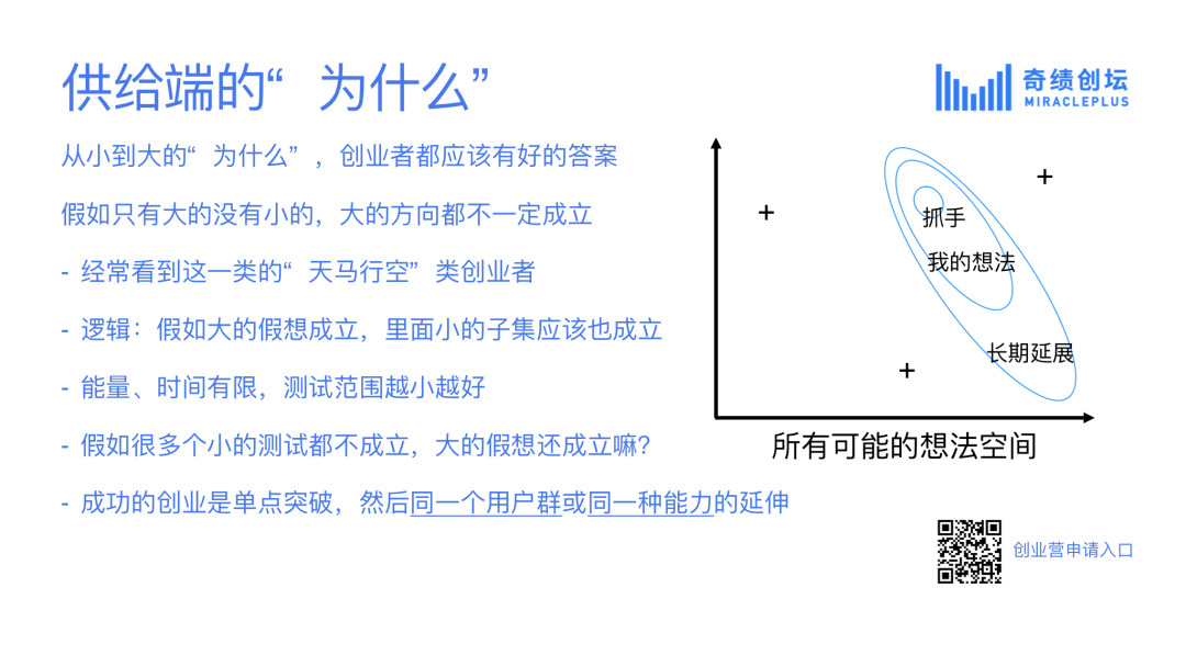 刚刚我们对每个项目都提了3-4个问题。不管是小的“为什么”,还是大的“为什么”,创业者都应该有好的答案。假如说我只有大的答案,比如我只能回答为什么要有电,或者为什么要推荐,这是不行的。为什么这么说?因为假如说没有小的“为什么”,我大的“为什么”都不一定成立。在奇绩创坛,我们看到的很多申请者,其实他只是有一个大的idea,他没有小的抓手。但假如你没有小的抓手,大的idea都不一定成立。就像是数学考试,你要证明一个等式成立。假如说我大的idea里,小的子集它都不成立,那整个等式就不能成立。我们本身的想法其实都是“假”想。这个“假”字要带个引号,是因为总不可能每个人每个公司都把他想法的所有可能性都测试一遍,我只是会挑一些小的点去测试。假如说他很多小点都不成立,那大方向还能成立吗?可能这个假想本身就是不成立的。