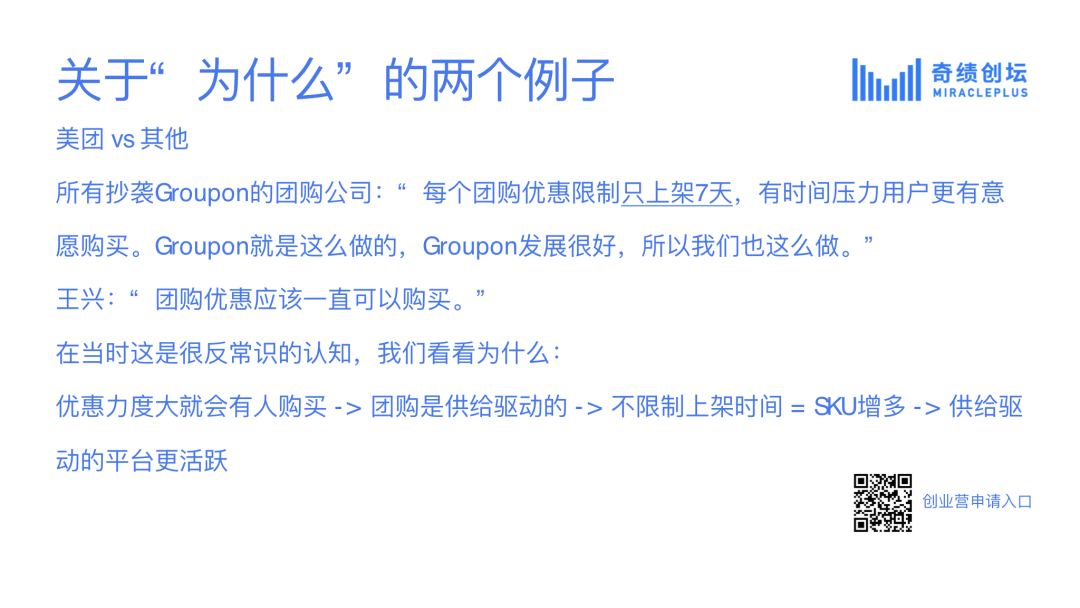 这个时候有一个叫王兴的人产生另外一种思路。他觉得不要给团购优惠做时间限制,反而要让大家可以一直享受这个优惠。这就是今天大家看到的大众点评或者美团上的持续性优惠活动。但在当时,这是一个非常反常识的认知。为什么这么说?因为大的优惠力度确实会促成用户的购买行为,但团购其实是供给驱动的。在同样的情况下,不去限制优惠在架的时间,那整个平台的SKU就增多了。而这个平台又是个供给驱动的平台,所以还会更活跃。事实证明他是绝对正确的,甚至当时美国团购的领导企业都没有想清楚这个问题。而这个认知带来的结果就是今天的美团要比Groupon成功得多。