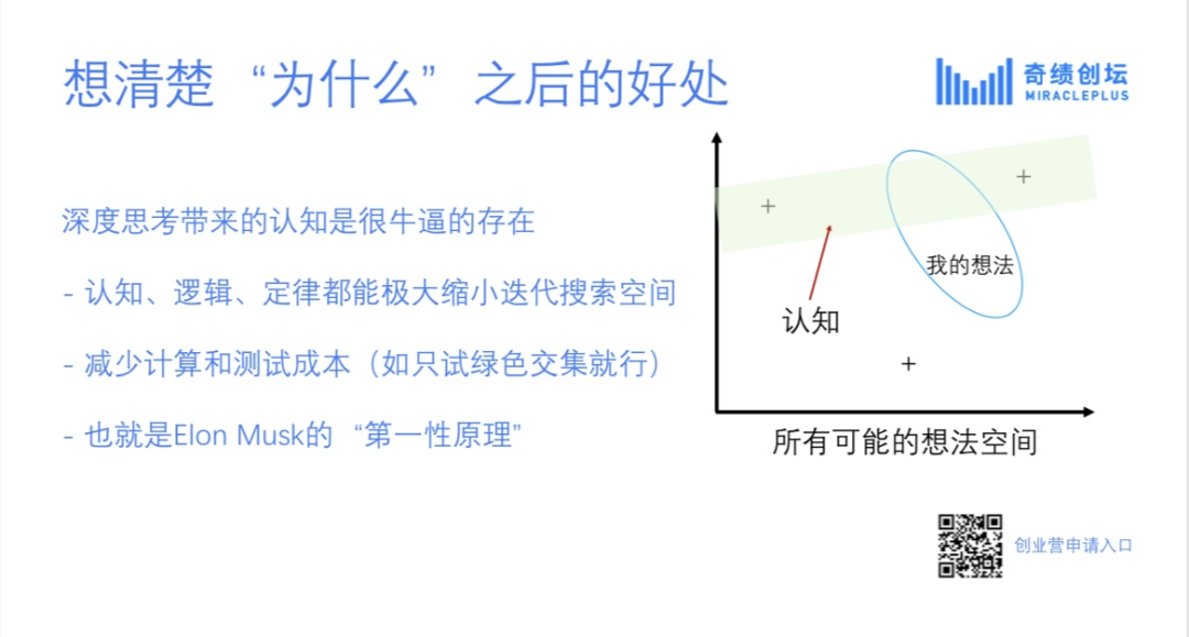 因此,想清楚“为什么”之后会有非常多的好处。结合刚刚和大家提到的“想法空间”,在有了一定认知和逻辑之后,这个空间是可以被大大缩小的。创业在某种意义上就是一个探索的过程,在这个过程中不是要让我把所有好的想法都试个遍,而是要在有限的时间和资源里找到一个比较好的场景,它讲究的是精度。而通过“为什么”这种认知能够帮助我们更快的去找到PMF。就像图上划出的这片绿色区域,它帮我减少计算、降低测试成本,我只需要去试绿色的区域就可以了。在图上看可能没有什么感知,放在现实生活里,最终每个公司每个人能够测试的也就是一小串或者一小列的内容,这个时候精准度就特别关键了。