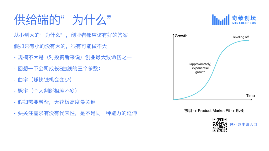 为什么会这样?因为很多创业者总觉得我今天做的事只要听起来好像跟后面的事是连贯的,那我就可以做。举一个很常见的例子,很多公司和我们说他今天是做To B的,然后后面会做To C的平台。听上去像是一个很大的故事,但其实完全连不到一起。在奇绩的申请里可以罗列出无数这样的项目,它们的小的“为什么”跟大的“为什么”连不在一起——因为卖法不一样。卖小公司是一套打法,卖大公司是另一套打法,而我卖给To C的用户那又是一套打法。卖法都不一样,那它肯定是连不起来的。卖法不同就决定了他的人才不同,组织也不同。假如说他不适应同一种能力,即使大的小的“为什么”都成立,整个故事依然还是不成立的。所以我们建议以终为始,在最终想做大方向里,在同一种能力基础上找到一个好的切入点。这是一种进阶玩法,我也看到过挺多这种情况的。