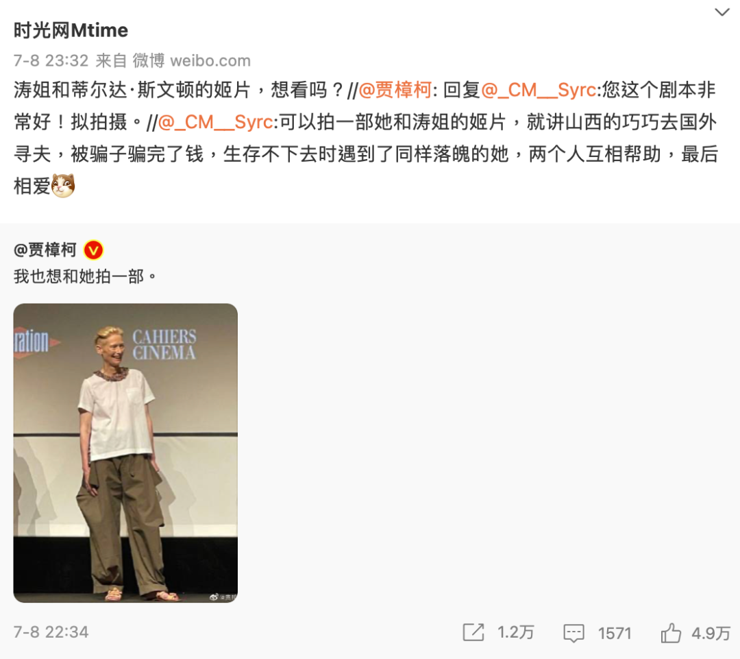 科长在微博放言,自己也想和蒂尔达·斯文顿合作,网友建议不如让她和涛姐拍姬片,期待炸了