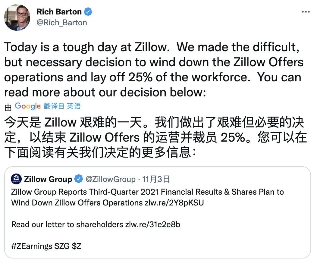 CEO巴顿宣布,今年内炒房业务Zillow Offers将关停。