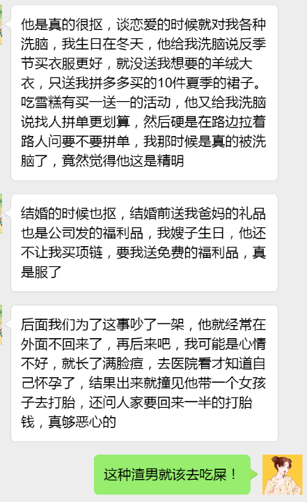 老实说,若不是她的自述,我真不敢相信这世上竟有这么渣的男人,连出轨都抠抠搜搜的,也不知道那个年轻的女孩子是喜欢他啥?