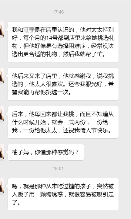 马玉川第三回到店里来时,还是径直找到她,让她帮忙挑选礼物,最后也还是像上回那样给她买了同款,离开以前,温柔地祝她情人节快乐。
