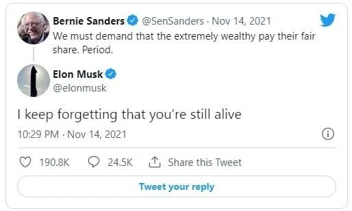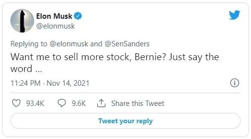 在随后的推文中,马斯克再次追问:伯尼,想让我卖出更多的股票吗?直说好了...