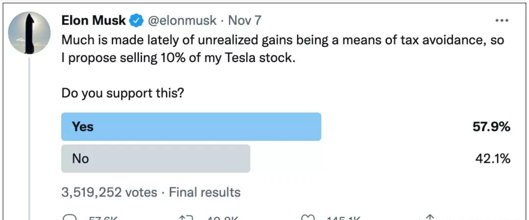 忙的停不下来的他卖完房产又马不停蹄的来出售特斯拉的股票,这次抛售股票起源于11月6日在推特上发起的一项“是否应出售10%特斯拉股票”的投票意见征询。
