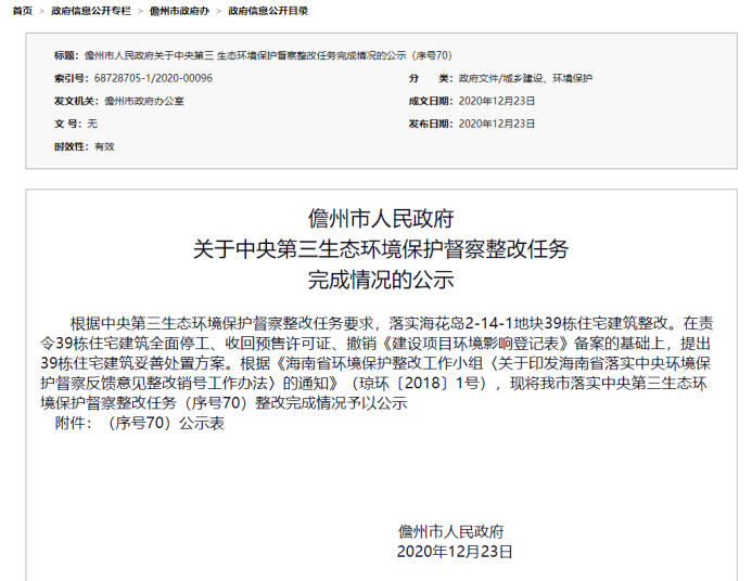 2020年12月23日,儋州新市长直接点名2号岛这39栋建筑,要求全面停工,并且收回了预售证。
