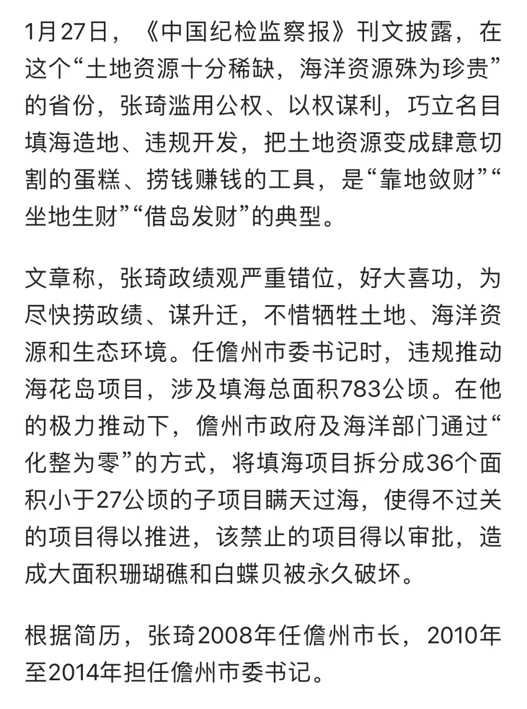 在张琦的极力推动下,儋州市政府及海洋部门通过“化整为零”的方式,将填海项目拆分成36个面积小于27公顷的子项目瞒天过海,使得不过关的项目得以推进,该禁止的项目得以审批,造成大面积珊瑚礁和白蝶贝被永久破坏。