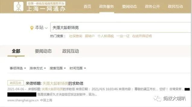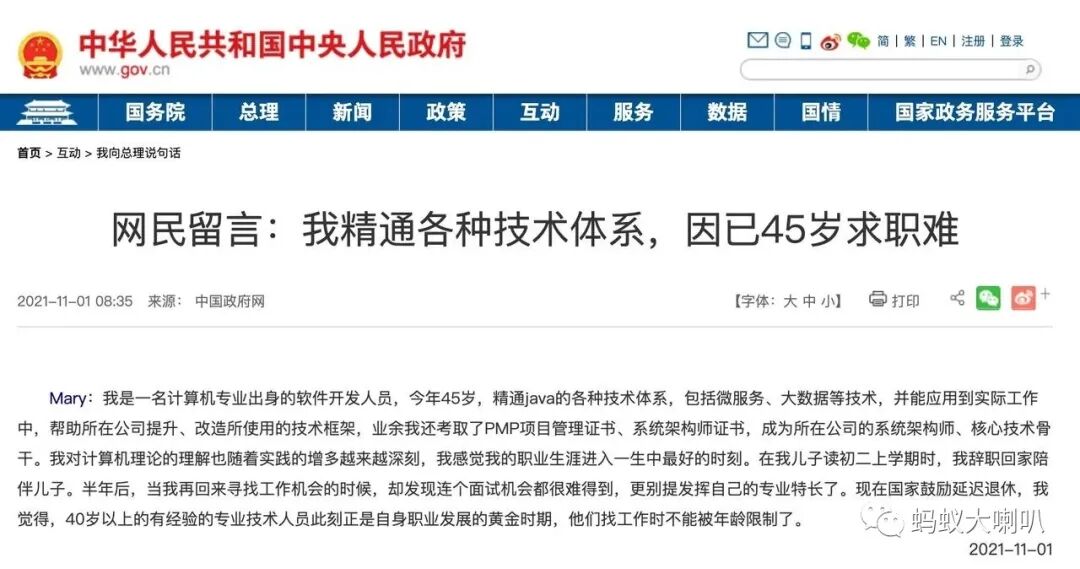 又是一起大龄失业男,向政府讨工作的事件。就在几个月之前,一个上海48岁自称是“本科、硕士是在重点大学就读”,当了20年高管的中年人,跑到上海市人民政府网站上向市长要一份工作。这回是45岁的程序员在向总理要一份。