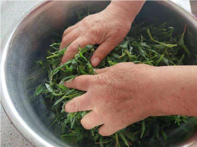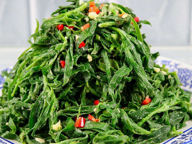 做法:首先把嫩扫帚苗洗净,控干水分;然后把控干水分的扫帚苗倒入盆内,在盆里加入少量的熟油和面粉,用手去搅拌均匀,让每片叶子都被面粉所包裹;最后在锅中烧水,把扫帚苗放入在蒸笼内,用纱布垫上,盖上锅盖,蒸5分钟。
