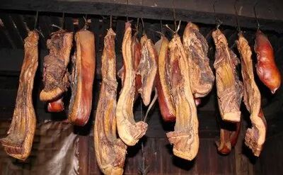腌制7天左右,再起缸挂在灶前或火塘上熏炕。讲究的人家要专打柏树枝或用花生、葵花、核桃壳烧火熏炕。这样炕出来的腊肉味道格外香美。