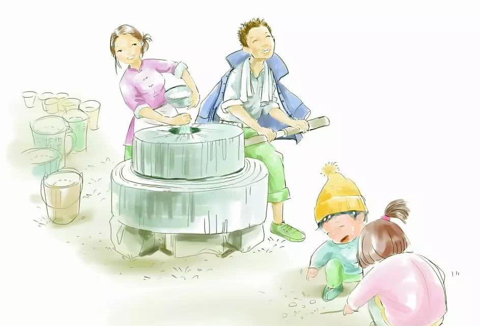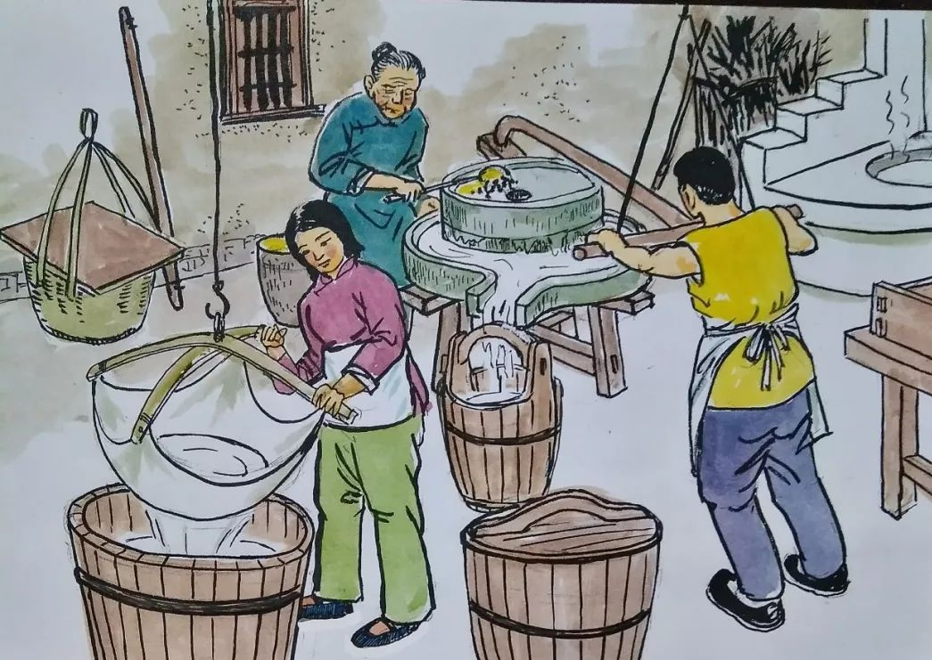 将糯米用石磨成米浆,磨好后用包袱装好,吊起来将水分沥干,就可以做汤圆了。汤圆沥干后,会将它掰成小块晒干,能保存到来年的五六月。