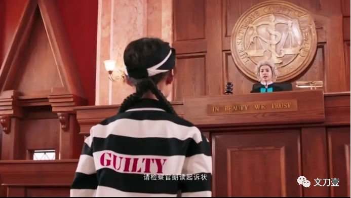 在MV的前半段画面,她穿着囚犯衣服接受审判。