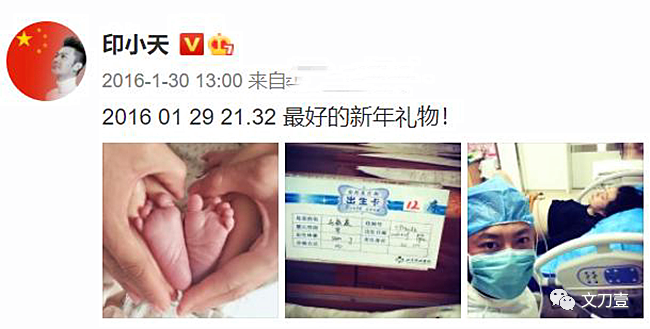 2016年1月30日,印小天怀里抱着娇嫩小巧的婴儿,满眼都是幸福和甜蜜。