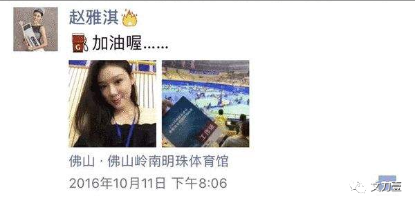 但有趣的是,赵雅淇却现身广东的体育场,并发了一条“加油”的朋友圈。