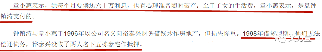 而关于钟镇涛破产的真实情况,其实是他和章小蕙一起投资炒楼,联名向香港裕泰兴借贷买豪宅。