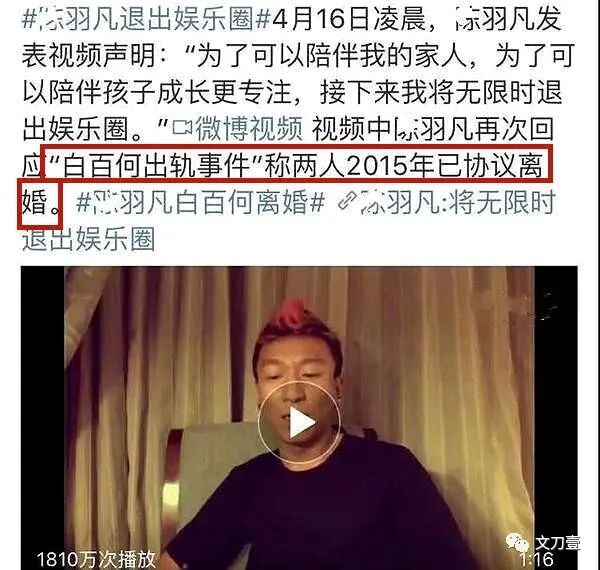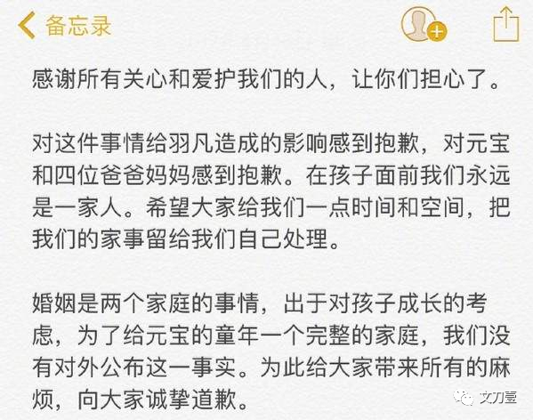 但紧接着,4月16日,羽凡发布视频声明,两人于2015年协议离婚。