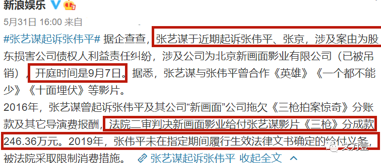 除此之外,还有另一个消息把张艺谋推上了舆论的风口浪尖。