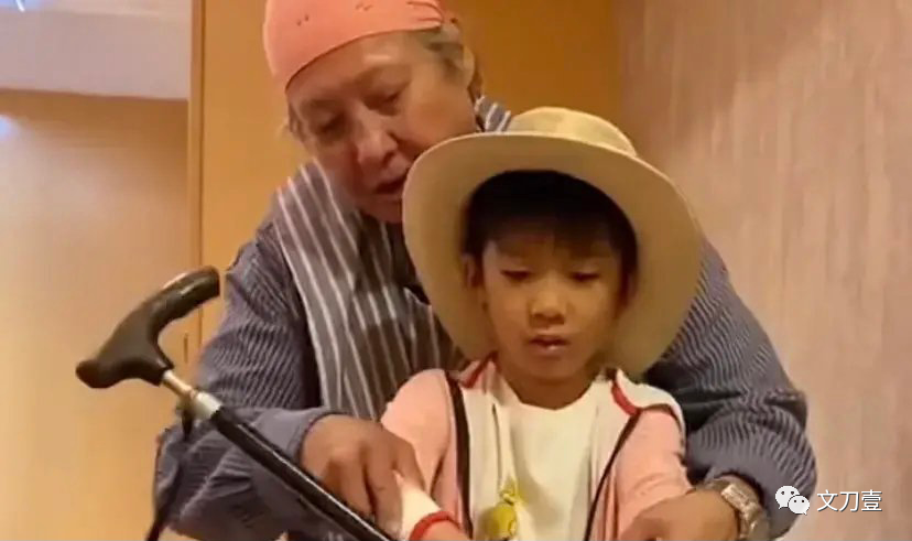 视频中,69岁的洪金宝用拄着的拐杖教孙子武功。
