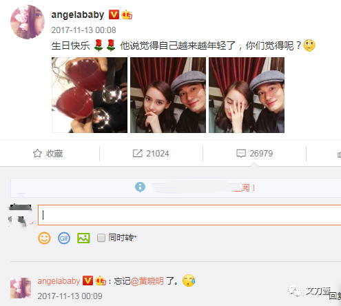 生完小海绵后,Angelababy还会在生日时发和黄晓明的合照。