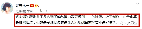 有音乐大V评价,“姚安娜的新歌差不多达到了90%的国内爱豆级别……的难听。”