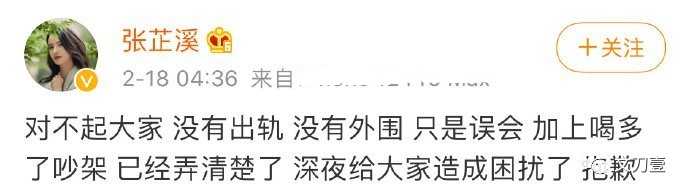 第二天早上张芷溪就表示自己是喝醉了吵架而已,没有出轨没有外围。