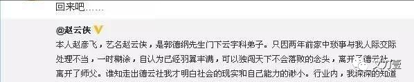 在郭德纲发文表态之后,曾经出走的徒弟赵云侠带着极尽肉麻的忏悔信突然回归。
