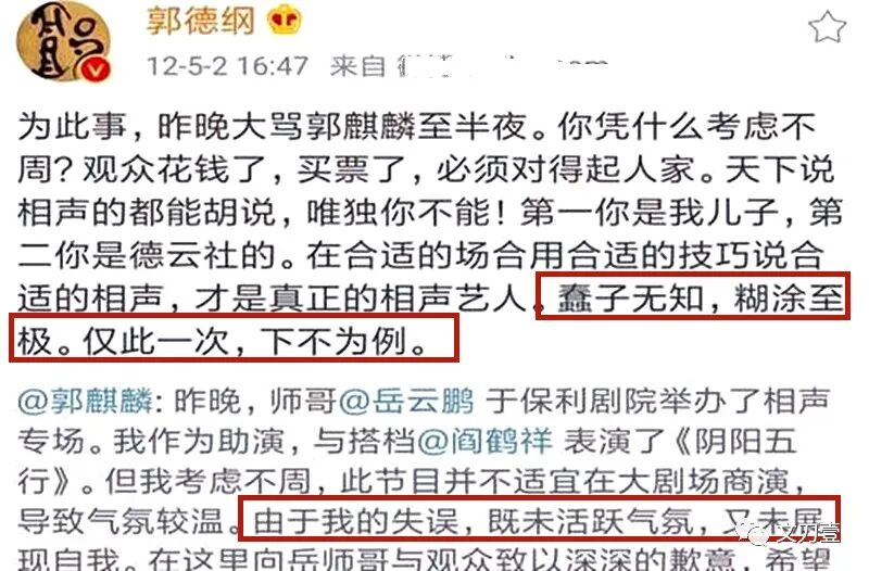因为郭麒麟没表演好,郭德纲大骂:“蠢子无知,糊涂至极”。