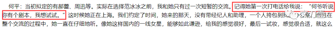 之后二人见面谈角色,范冰冰也毫不耍大牌,认真谦逊,给何平留下了好印象,才选她参演。