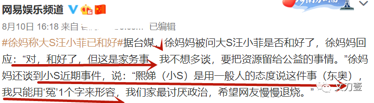 直到8月10日,徐妈出来帮两个女儿收尾,说大S跟汪小菲和好了,小S很冤枉。