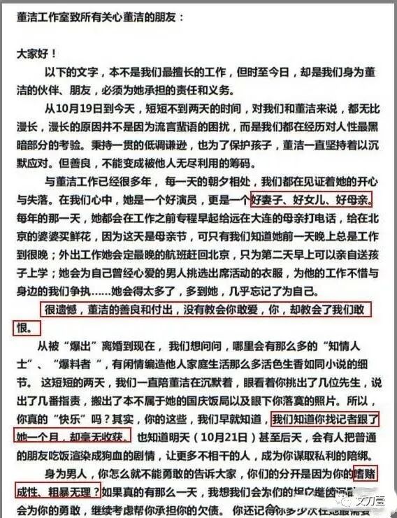 为了使舆论对自己有利,董洁工作室发出声明,指责潘粤明不顾家庭,沉迷赌博,甚至还家暴。