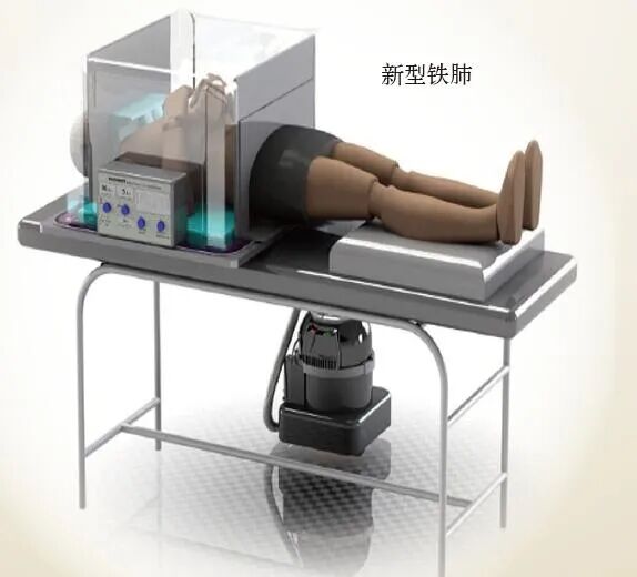 它把病人的身体完全封闭在内,密不透风,依靠一个风箱的推拉,反复在内部制造负压(低于外部气压),迫使气流进出患者的肺部。风箱靠电力推动,如果停电,也可以手动操作。