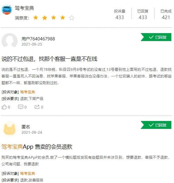 截至2021年10月15日,黑猫投诉平台上关于驾考宝典的投诉达到了433条,投诉原因集中在“考不过补偿”服务理赔问题、考试题库与实际考试内容不符、误开VIP等问题上。