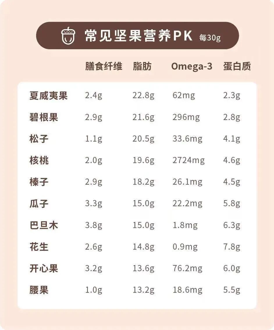 同一种营养成分在不同种类的坚果含量千差万别。例如,仅一颗巴西坚果就能提供100%以上的硒参考日摄入量。