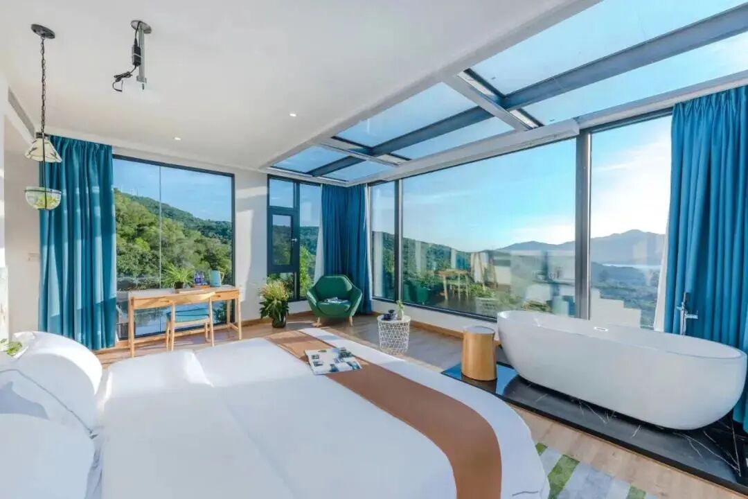 仅有7间房,推荐海景玻璃星空房和山景玻璃星空房。三面落地窗正对睡床,躺在床上就能看斗转星移。