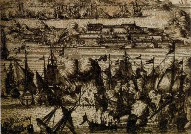 当荷兰人驾驶着大型战船靠近热兰遮镇时,才发现这里的的海水过浅,火炮根本无法正常瞄准,炮弹要么从郑军头上飞过去了,要么直接飞进了热兰遮城,与此同时,火炮阵地上的郑军以极其惊人的速度组织起了反击,荷兰战船纷纷中弹起火,甚至还有科克伦号上的荷兰士兵在慌乱之中引燃了火炮弹药引起了一次不小的爆炸,炸死了九人,这无疑加剧了荷兰人的混乱。