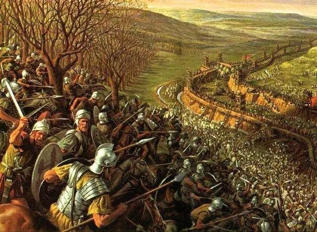不久,他们在那向巴格拉达河倾斜的高地最低坡上,看见萨布拉的队伍正在与罗马骑兵交锋;来到的兵团就帮着把他们驱逐得完全下坡而入平原。可是在这里,战局起了变化。他们本以为萨布拉没有后援,其实不然;他距努米底亚主力军不过七八公里,努米底亚精锐的步兵以及高卢和西班牙的骑兵二千人已来到战场援助他,并且国王率大部军队和战象十六头也正向前来。在夜间行军和激烈战斗之后,此刻罗马的骑兵共计不过二百人,这些骑兵与步兵同因劳苦和战斗而疲惫已极,于是在他们被诱到的广大平原上,不断增加的敌军把他们团团围住。