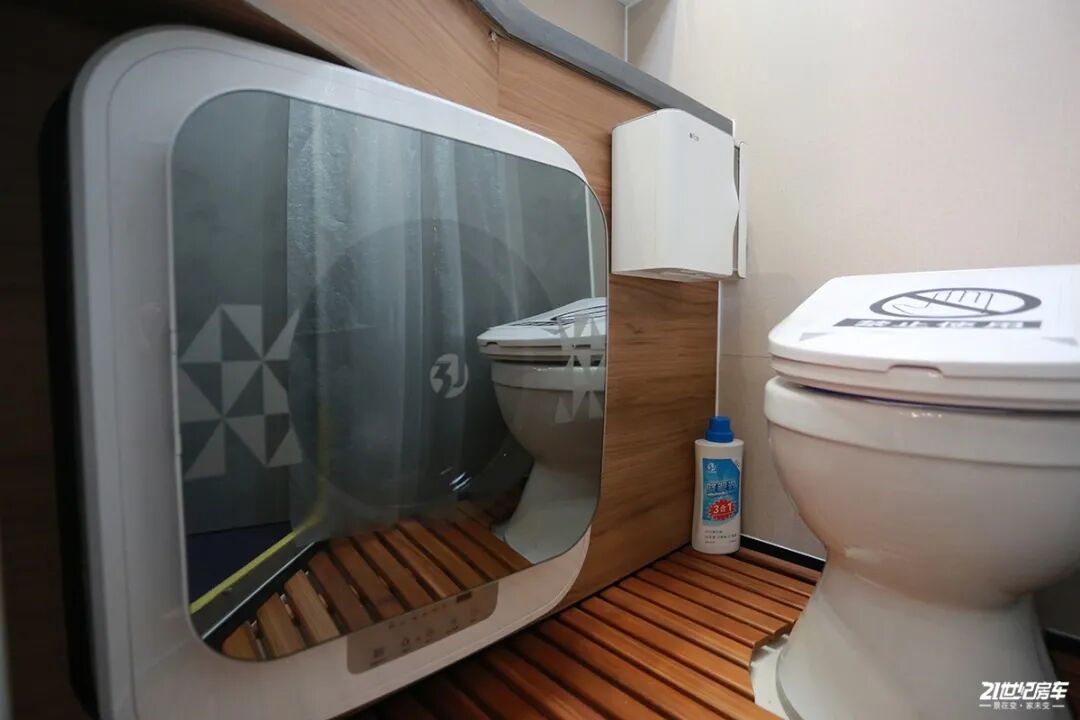 卫生间位于车辆尾部,内部配有电动粉碎式马桶、洗脸池、抽拉式水龙头、洗衣机、纸巾盒等。卫生间地板采用防滑设计,防止洗澡时滑倒。