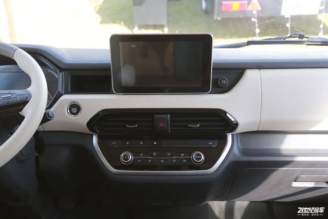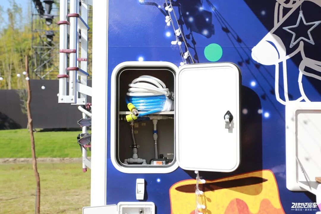 车身尾部和右侧的配置比较丰富,车尾配有自行车架、折叠爬梯、倒车影像摄像头等;车身侧面配有注水口、储物舱、外置翻折台面、外置厨房、遮阳棚等。