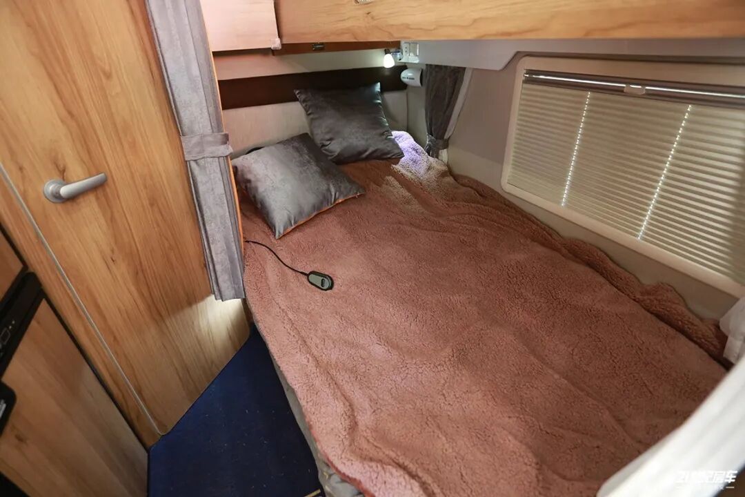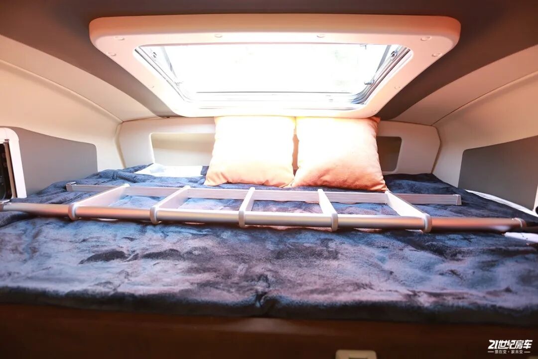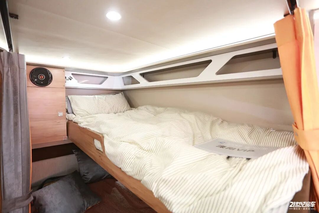 车尾床采用上下铺子母床的形式,下铺可容纳两人睡眠,上铺可容纳一人睡眠。上铺旁边配有储物格,可以用来在睡觉的时候存放随身物品;整体床铺旁边还配有隐私帘,隐私性比较不错。