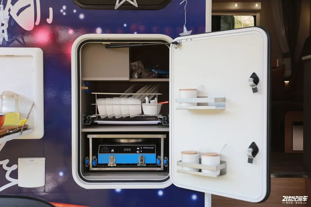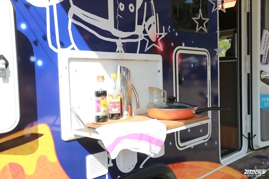 车外的厨房配有专门的折叠操作台面、抽拉灶、抽拉式碗架、调料罐架等。